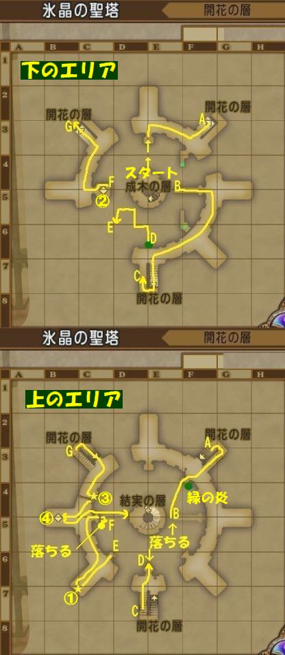 ※開花の層では今までの経験をふまえて難しいギミックを進んで行きます。 便宜的に上のエリアと下のエリアという言葉を使いますが下のマップ地図と照らし合わせて参考にしてください。