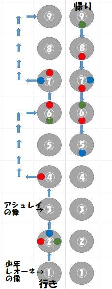 ※図の左が行きで右が帰りになります。部屋に数字はないですが説明のために付けています。