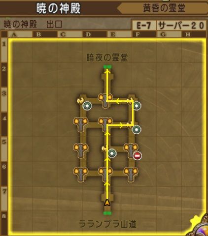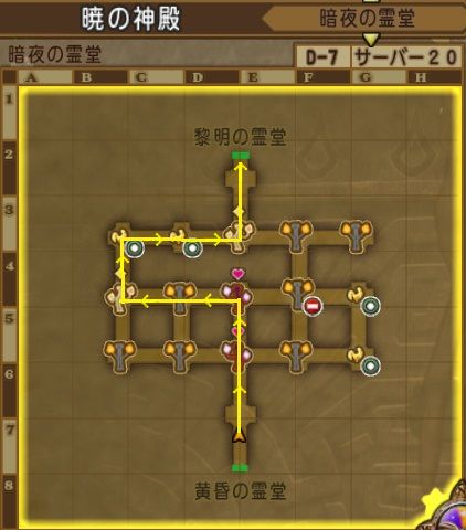 ※3つ目のマップはやや複雑です、途中で天窓の光に触れて来た道を戻る感じになりますが、あとは黄色の線の通りに進んでください。
