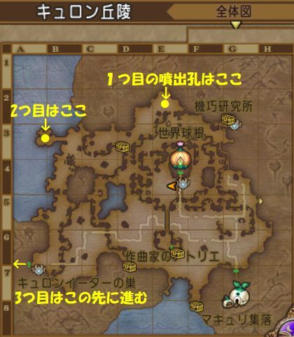 ⑭まずキュロン丘陵の2か所の噴出孔で「活原棒」にエネルギーを充填する。
